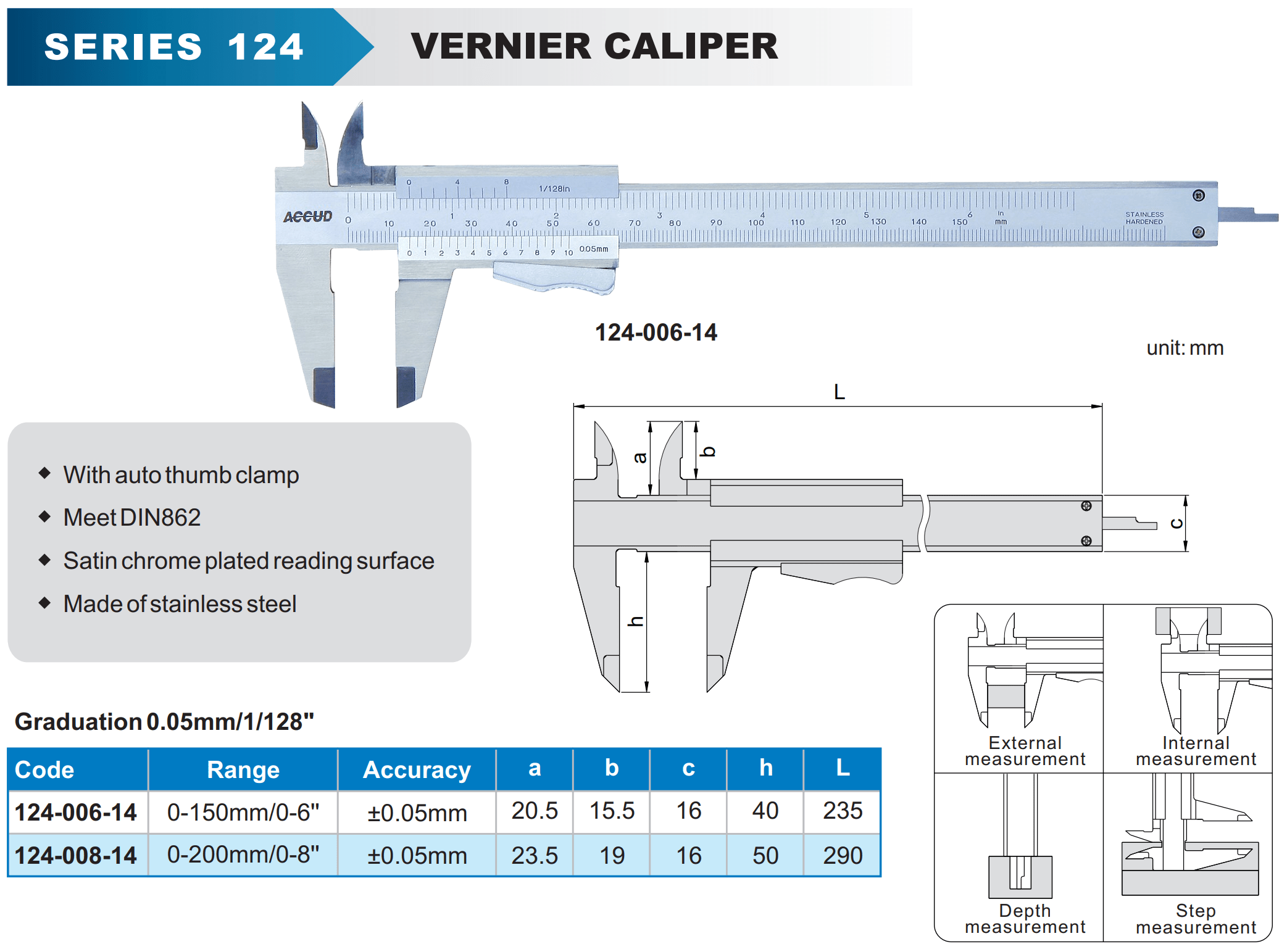Vernier Caliper 150mm Auto Thumb Clamp 0.05mm Acc. 0.05mm Grad. S/stee