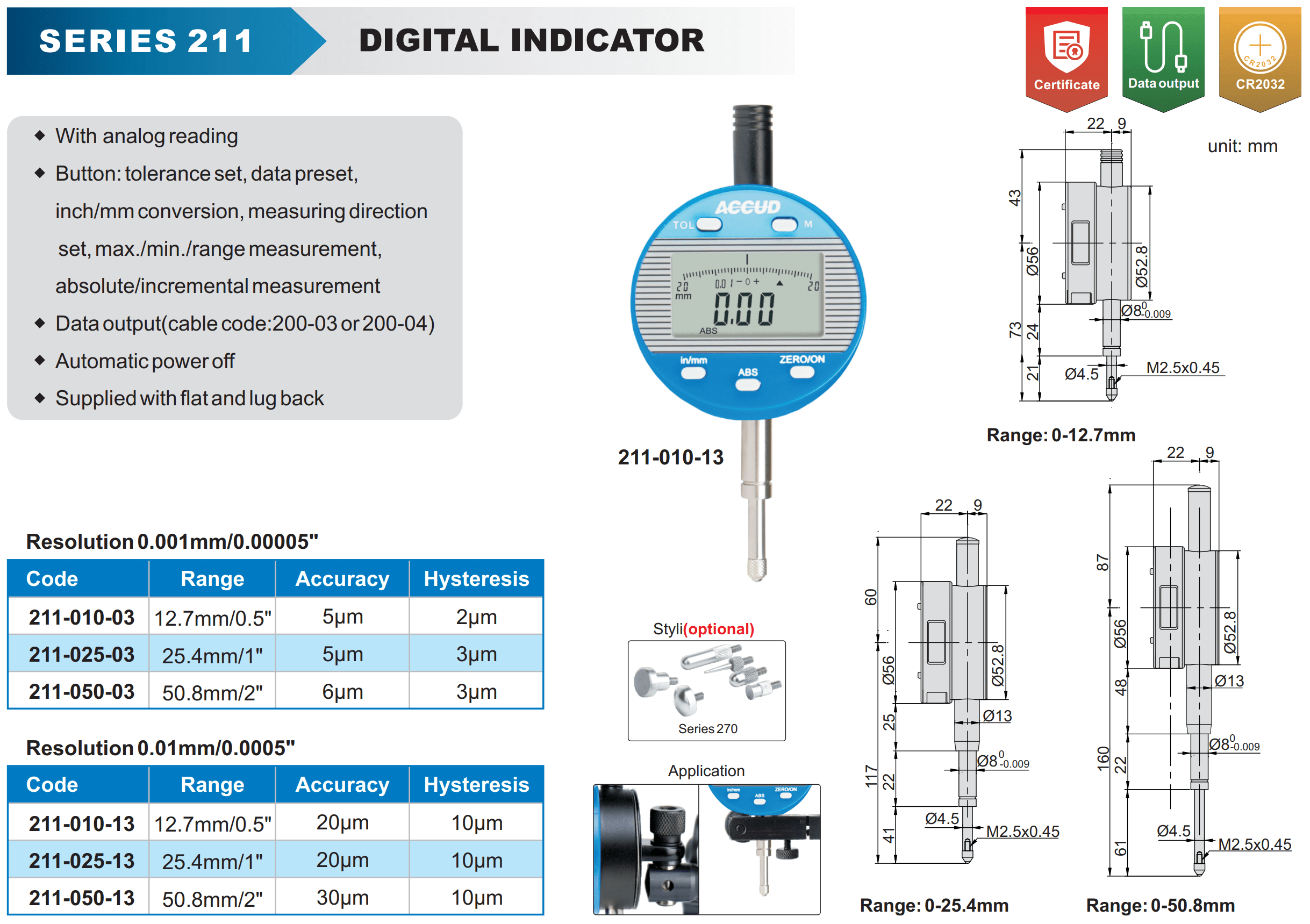 - Button: tolerance set, data preset, inch/mm conversion, measuring direction set, max./min./range measurement, absolute/incremental measurement