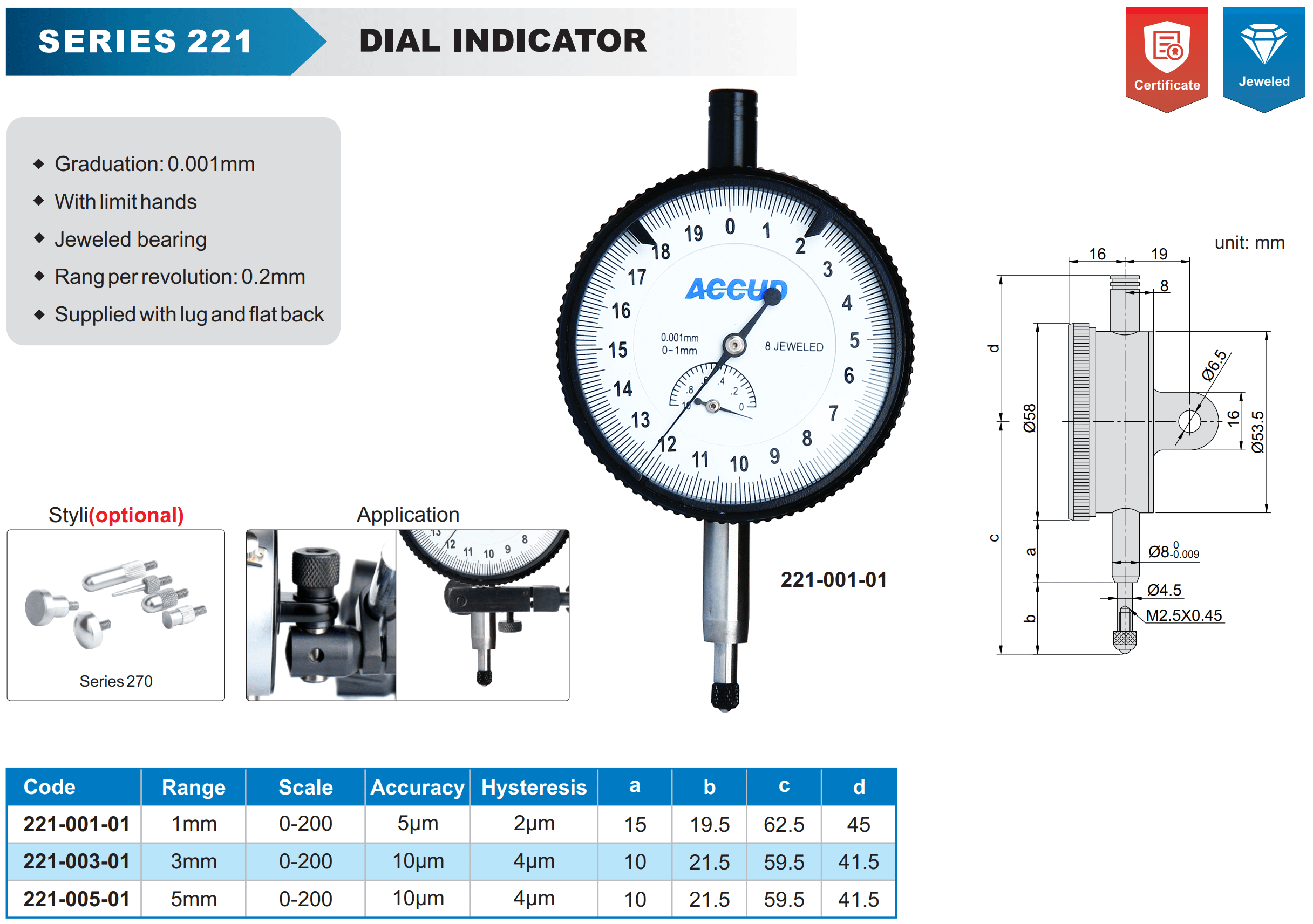 Dial Indicator 5mm 0.001mm Grad. Lug&flat Back