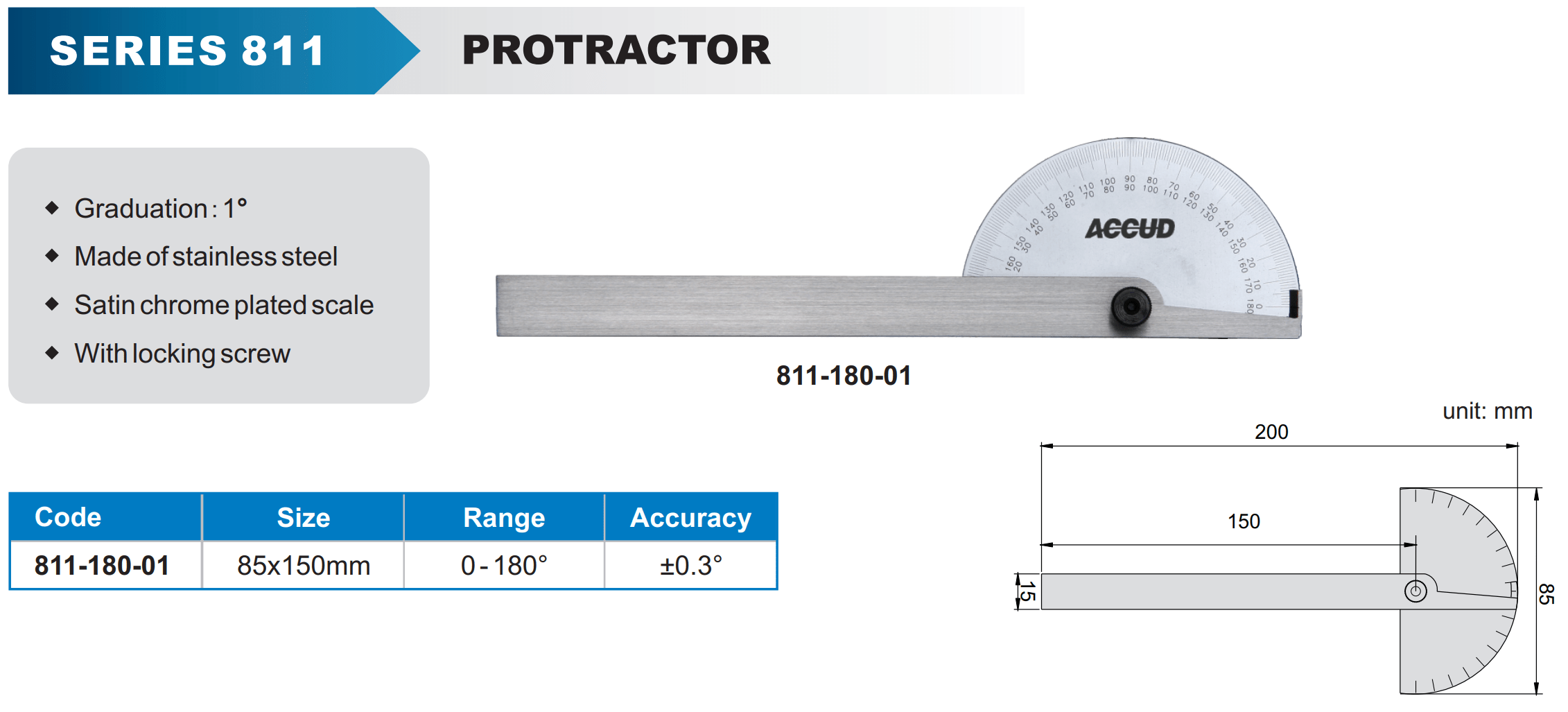 Protractor 85x150mm 180 Deg. 0.3 Deg. Acc. 1 Deg Grad.