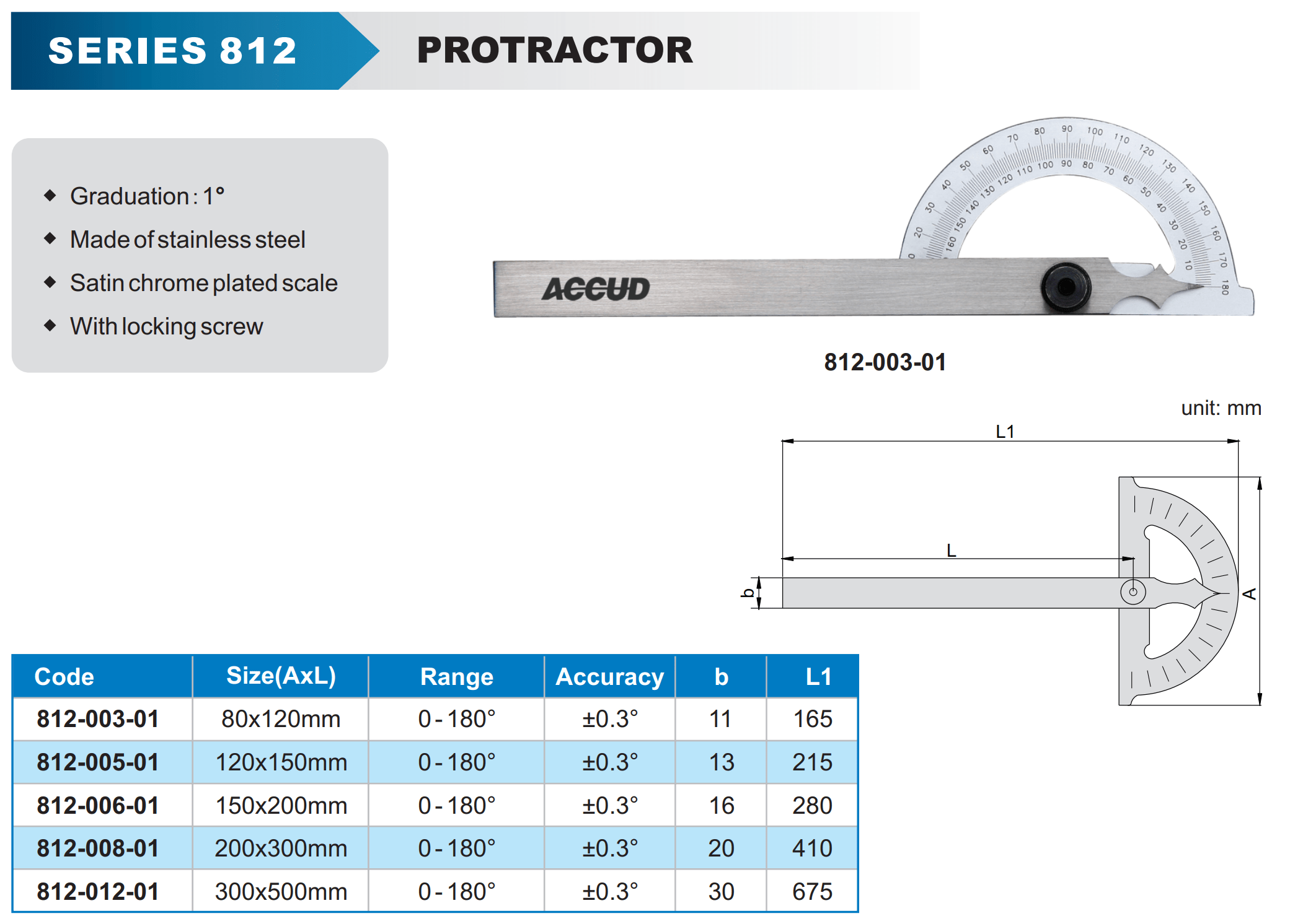 A fundamental tool used for measuring and constructing angles. It is widely used in various fields, including mathematics, engineering, drafting, carpentry, and more. The basic design of the protractor is a metal semi-circular scale, marked with degree markings/measurements and a lockable movable arm with a pointer, allowing users to measure angles with precision.