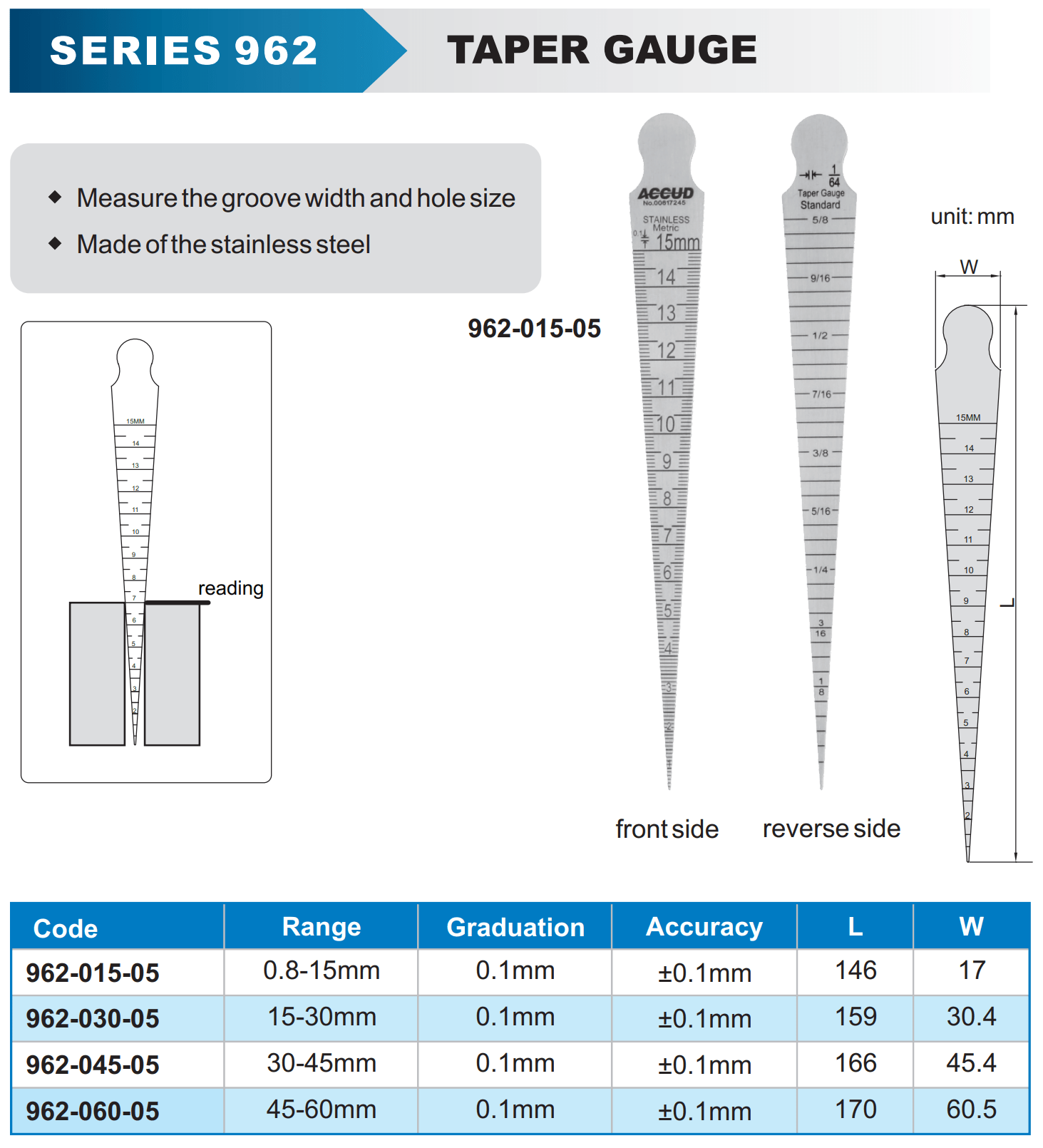 Taper Gauge 0.8-15mm 0.05mm Grad. 0.05mm Acc. S/steel