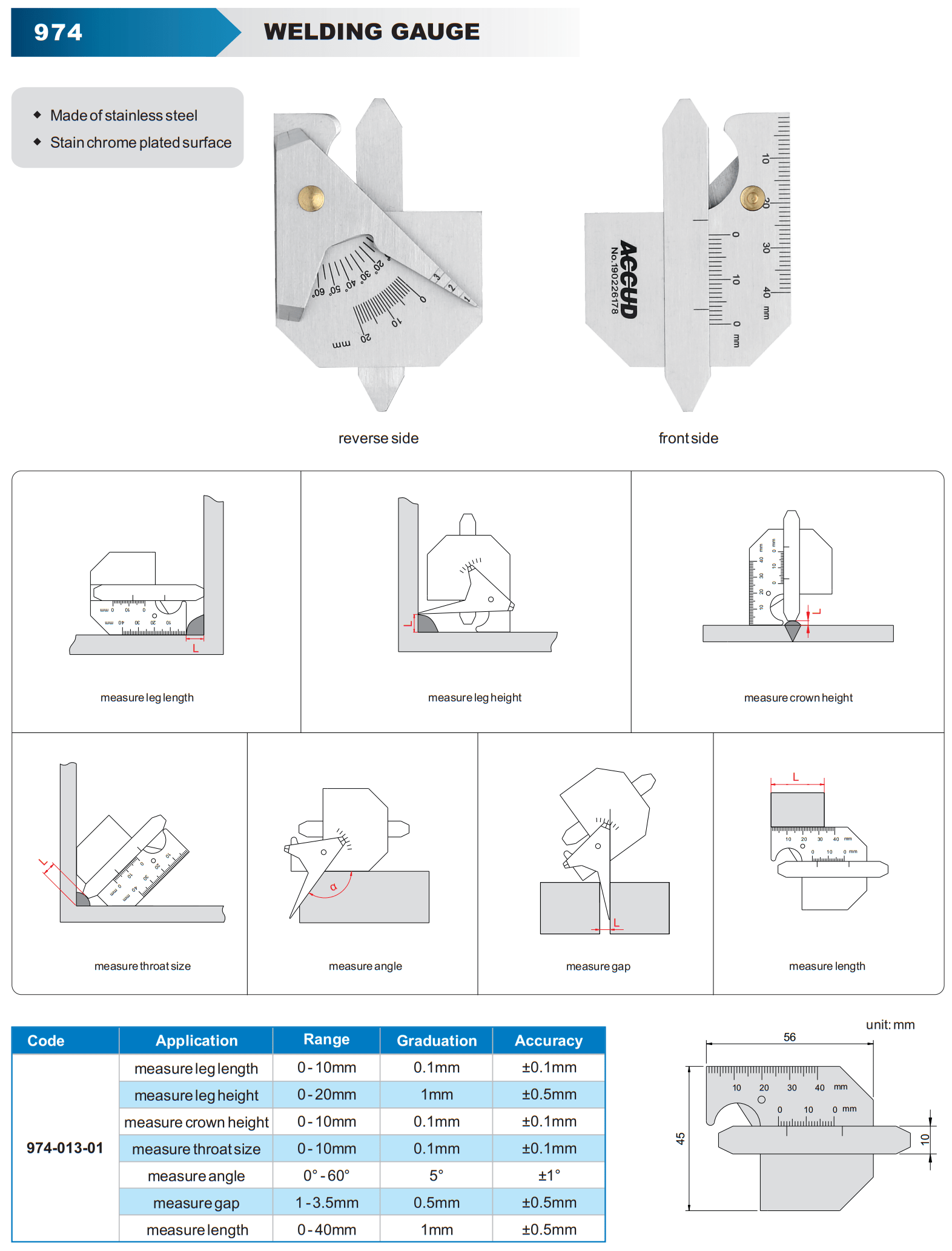 - Multiple measuring blades: Allows for measuring different parameters like bead width, depth, and undercut.