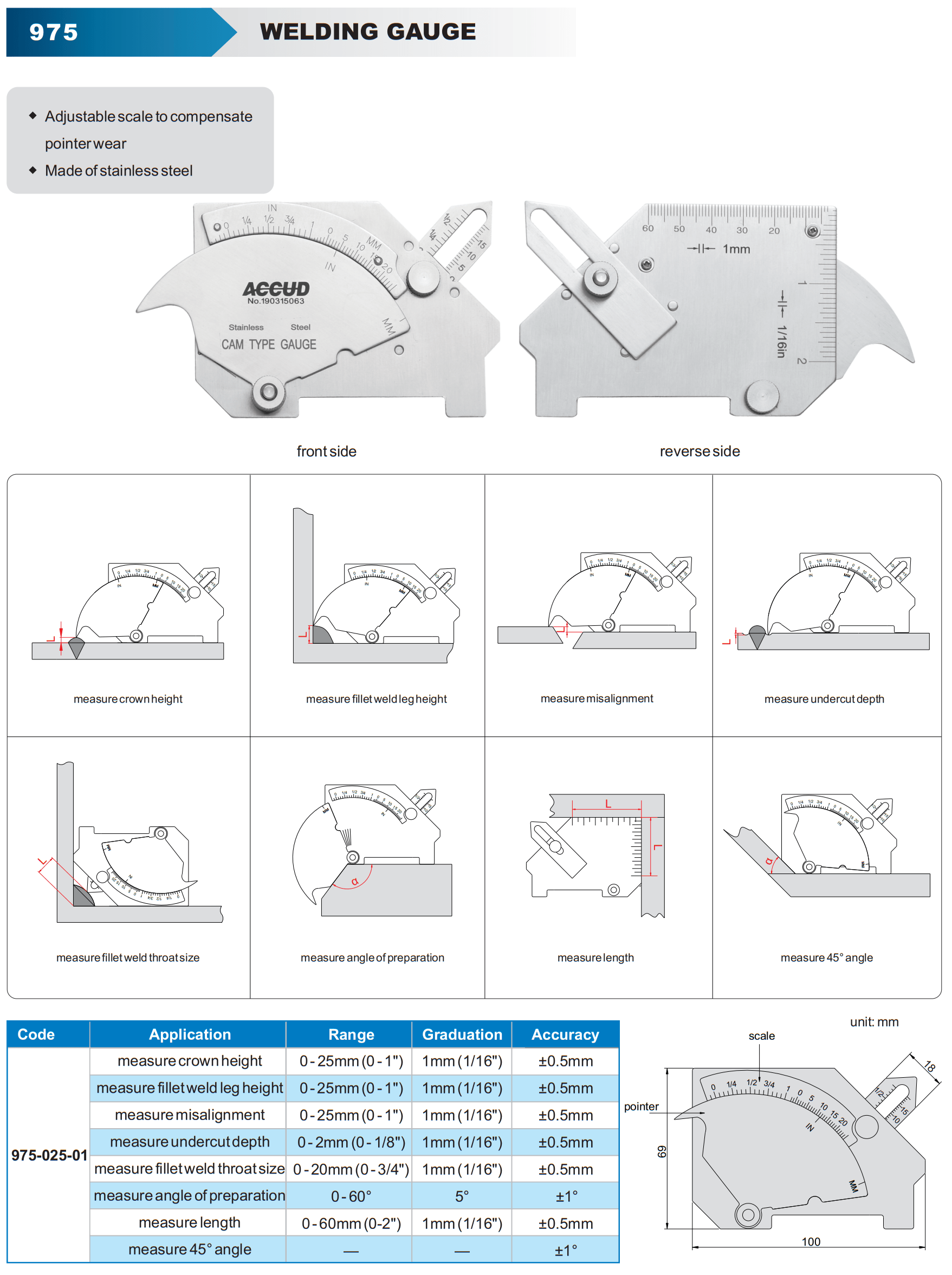 - Multiple measuring blades: Allows for measuring different parameters like bead width, depth, and undercut.