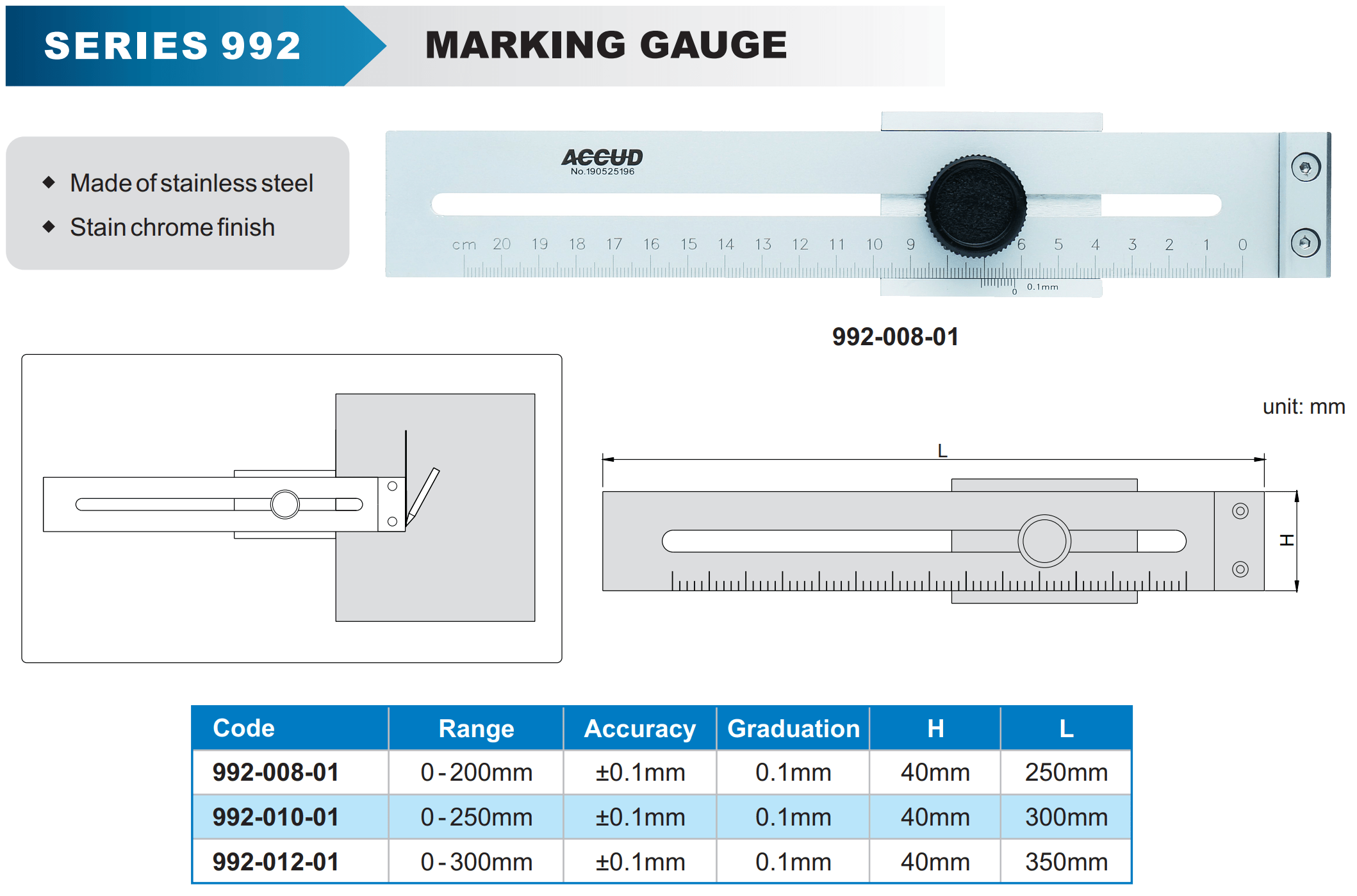 The Accud Stainless Steel Marking Gauge is an accurate tool for precise scribing and measuring. Engineered for accuracy, this marking gauge features a robust stainless steel construction that ensures long-lasting durability and resistance to wear. Its finely etched metric scale allow for detailed and consistent markings, ideal for woodworking, metalworking, and other precision tasks. The smooth, adjustable locking mechanism ensures secure settings, enabling repeatable measurements with ease. Perfect for professionals and DIY enthusiasts alike, this tool guarantees flawless, high-precision results on every project.
