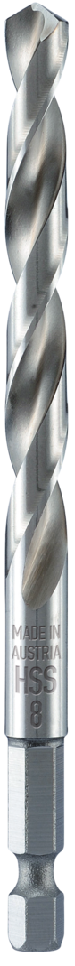 HSS twist drill ground from solid, bright finish: toughness and precision combined with excellent cutting efficiency for drilling alloyed carbon and plain steel.