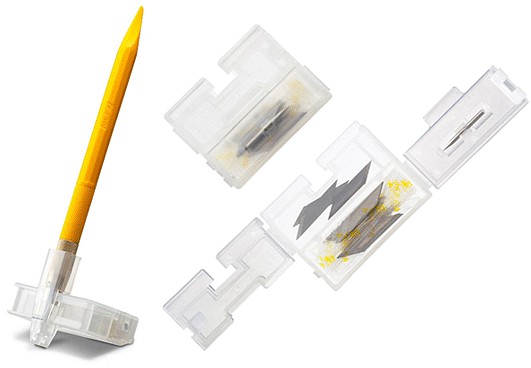 The square-shaped spare blade case works as a stand when connected to the blade cover. The