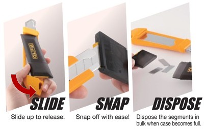 With the OLFA® SNAP it 'N' TRAP it™ utility knife, you can remove dull blade edges easily and safely. Simply slide the blade disposal container off the knife, insert the dull blade into the end of the container and snap it off. The old blade disappears into the container, and a sharp new blade is ready for use.