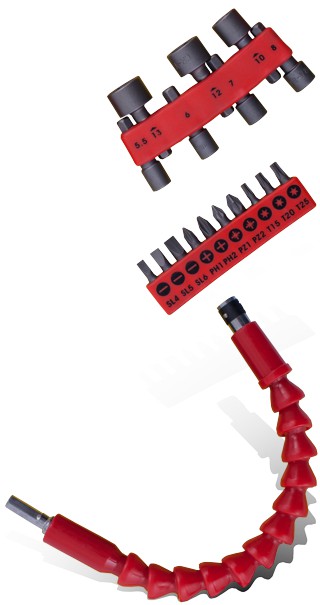 | Content | 1 x Flexible shaft 1 x 5.5mm Nutsetter 1 x 6.0mm Nutsetter 1 x 7.0mm Nutsetter 1 x 8.0mm Nutsetter 1 x 10.0mm Nutsetter 1 x 12.0mm Nutsetter 1 x 13.0mm Nutsetter 1 x PH1 (Philips) insert bit 1 x PH2 (Philip) insert bit 1 x PZ1 (Pozi) insert bit 1 x PZ2 (Pozi) insert bit 1 x SL4 (Slotted) insert bit 1 x SL5 (Slotted) insert bit 1 x SL6 (Slotted) insert bit 1 x T15 (Torx) insert bit 1 x T20 (Torx) insert bit 1 x T25 (Torx) insert bit |