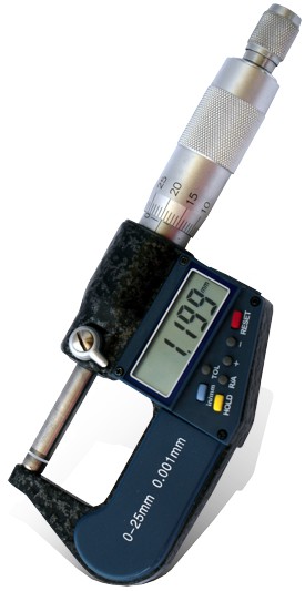 The beveled edge of the thimble is divided into 50 equal parts with each line representing 0.01mm and every fifth line being numbered from 0-50. Thus the reading is given by the number of millimetre and half-millimetre divisions visible on the sleeve plus the number of hundredths of a millimetre indicated by the thimble graduation which coincides with the central long line on the sleeve.
