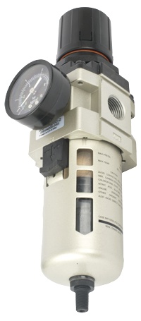 A regulator is combined with the filter to increase or decrease the pressure. A pressure gauge indicates the set pressure.