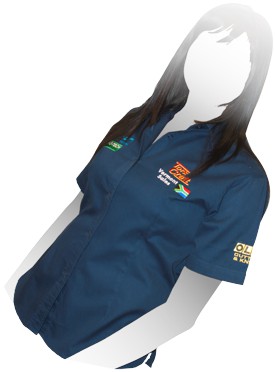 The blouse represents the Vermont Sales company. The leading brands are embroidered on the sleeves and the chest.
