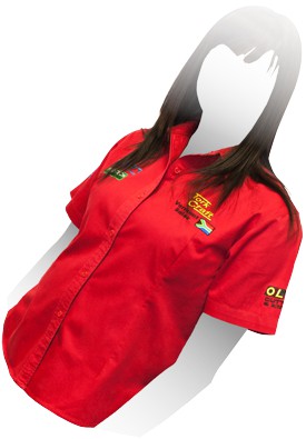The blouse represents the Vermont Sales company. The leading brands are embroidered on the sleeves and the chest.